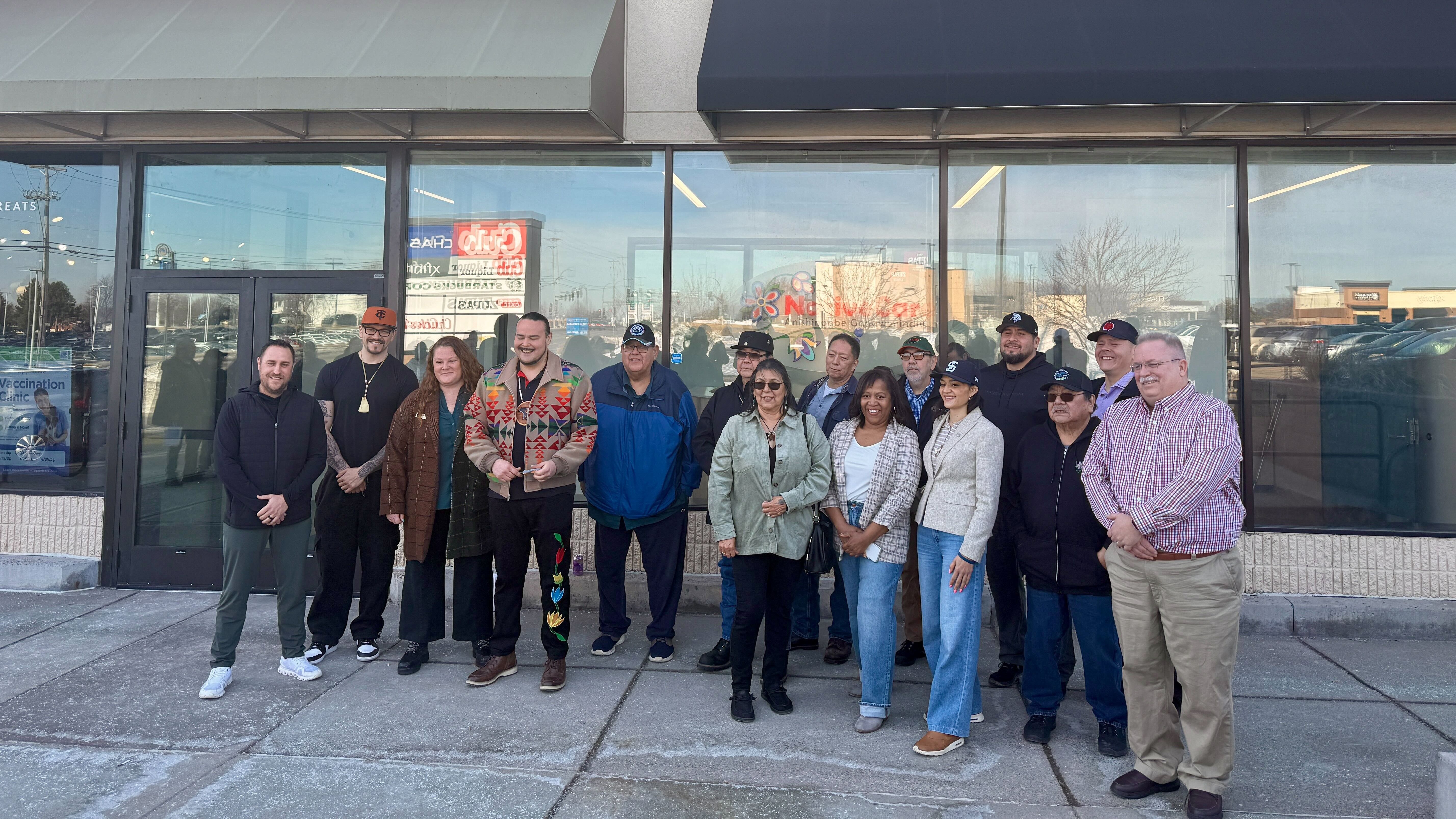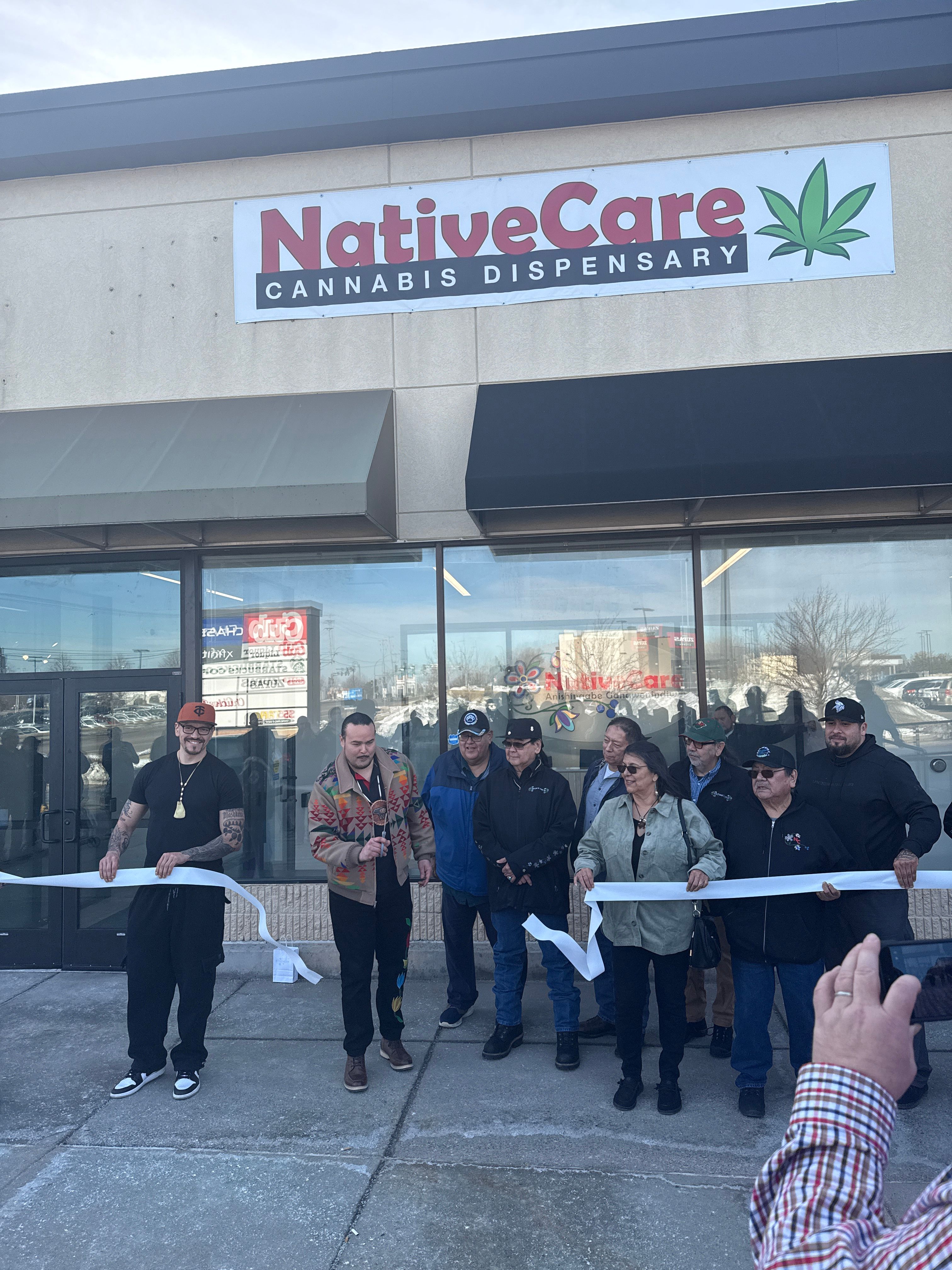 The Red Lake Tribal Council and West St. Paul city council members pose in front of the newly opened NativeCare dispensary.